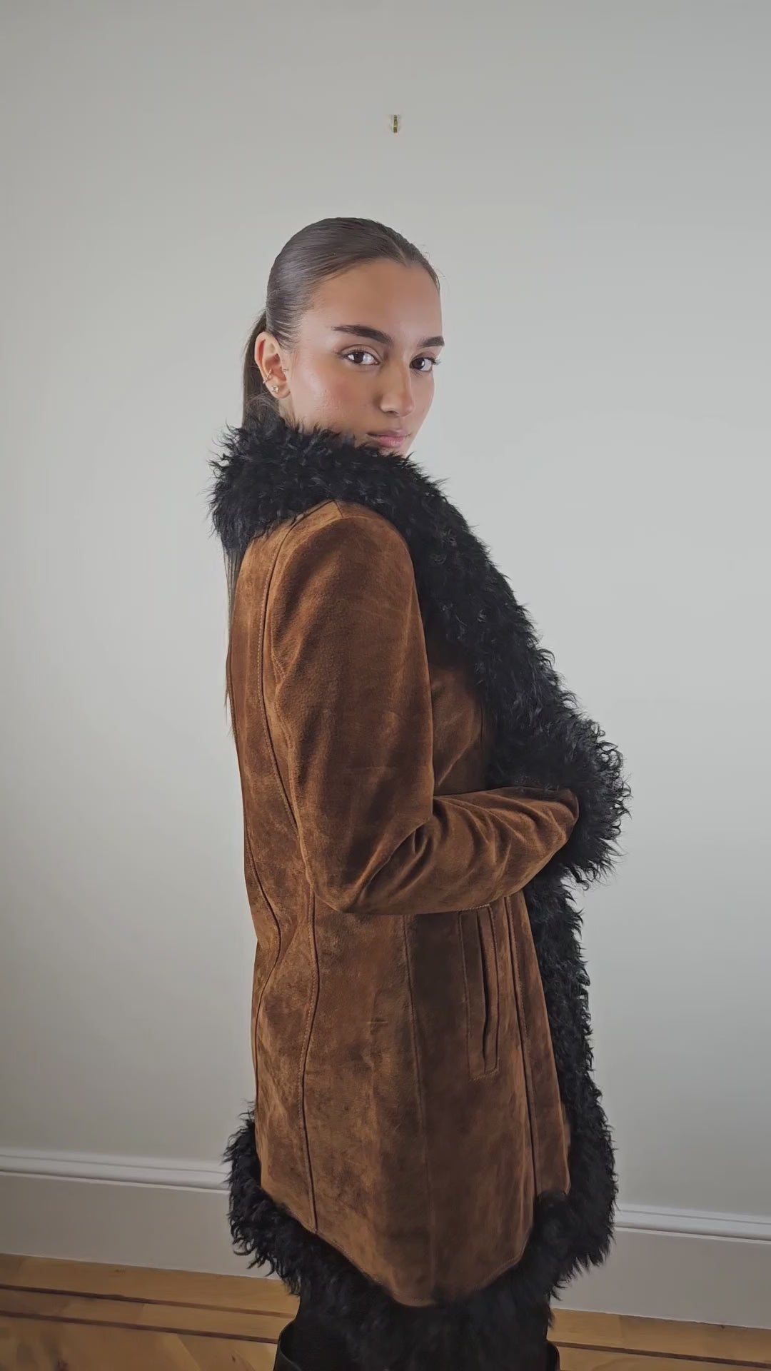 The Liya Coat is crafted from soft suede and adorned with natural Mongolian fur. Perfect for mild days, it boasts both style and comfort.