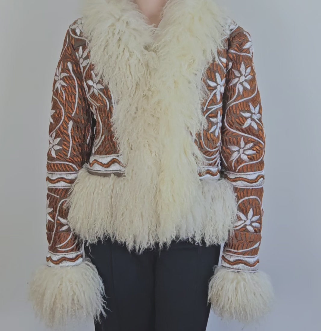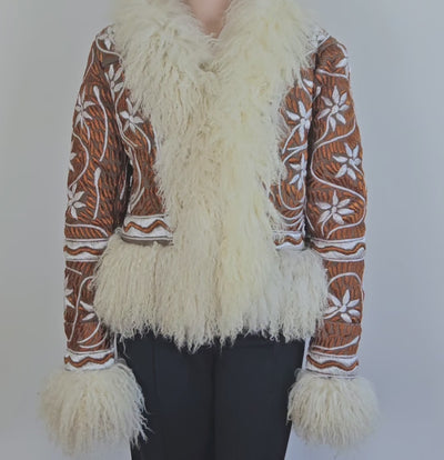The Ghazali jacket is a poetic tribute to Afghan craftsmanship — bold in presence, rich in tradition. Hand-embroidered in striking ivory thread on a deep copper suede base, it’s trimmed with soft, voluminous natural shearling that offers both warmth and drama.