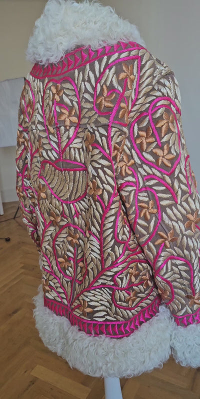 Handmade from thick, insulating shearling and lined with rich embroidery in white and earthy bronze tones, Laleh offers exceptional warmth without compromising elegance. The oversized floral motifs are deeply rooted in Afghan textile traditions, celebrating the land’s strength and artistry.